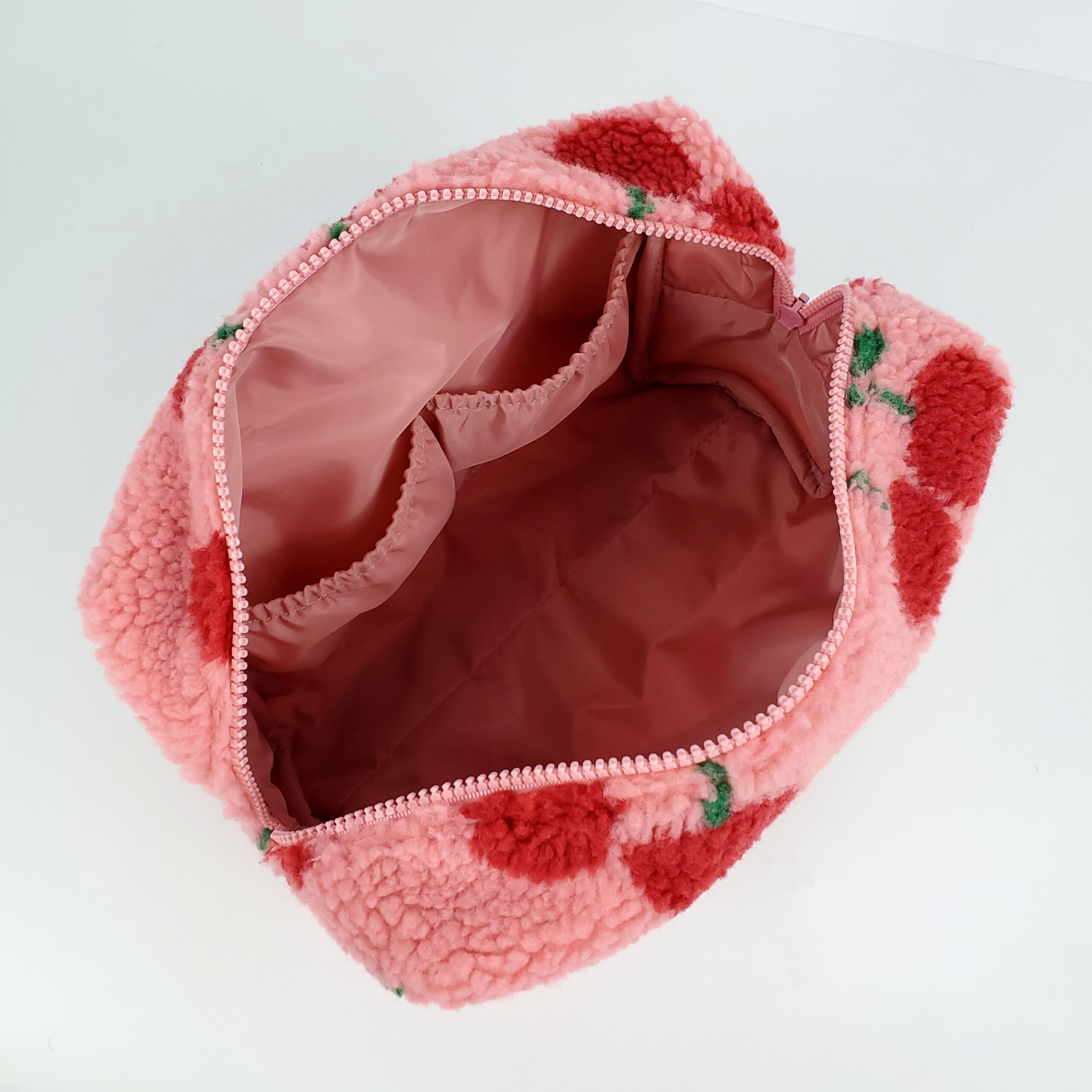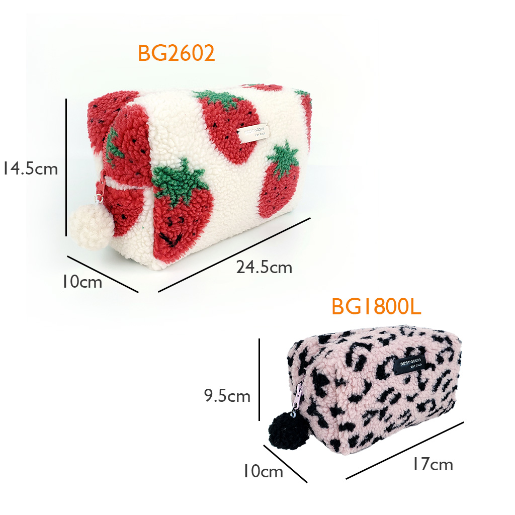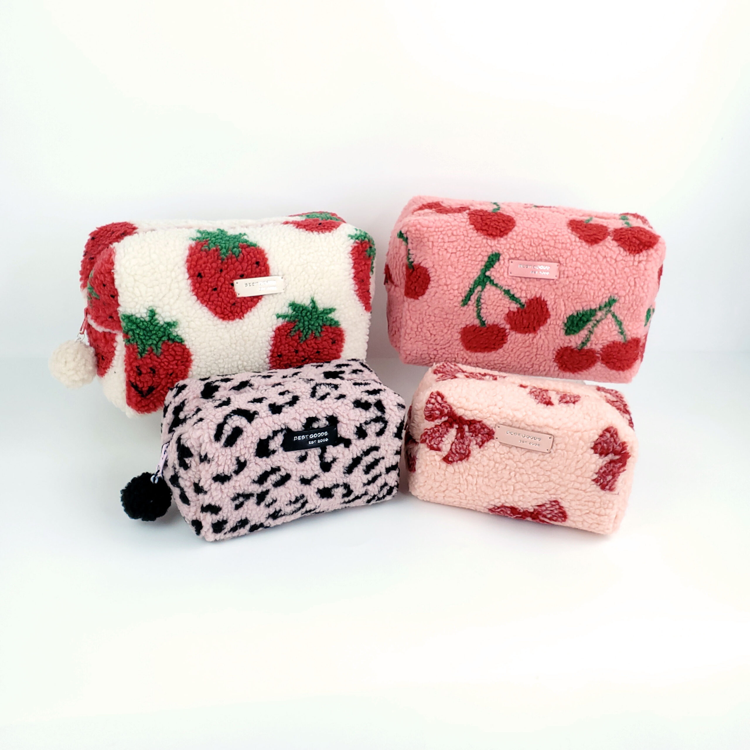 Elevate your beauty routine with this exquisite teddy velvet cosmetic bag. Boasting a new design, it blends pink cute aesthetics with trendy strawberry leopard print, while the fluffy texture adds a luxurious touch. Available in any sizes for versatile use, and customizable with your own label or logo—both stylish and practical for everyday carry or travel.